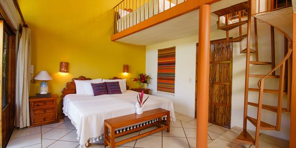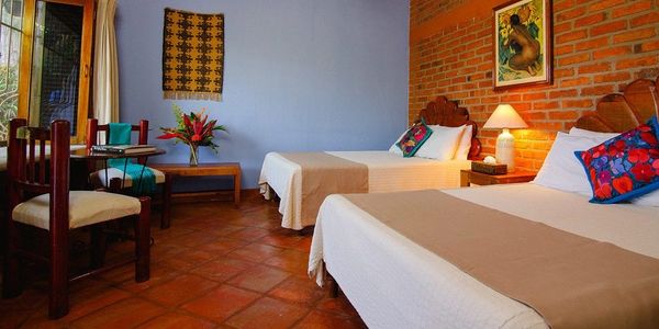 Guest Rooms are decorated in bright and cheerful Mexican textiles and colors, providing a cozy and well appointed option for those seeking simplicity and comfort. All rooms have en-suite bathrooms with natural bath amenities. Rooms are located on both ground level and third floors, either jungle or garden facing.